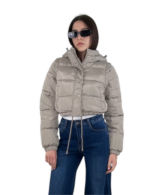 Giubbino imbottito con taglio corto chiusura centrale con zip e bottoni a pressione cappuccio imbottito...
