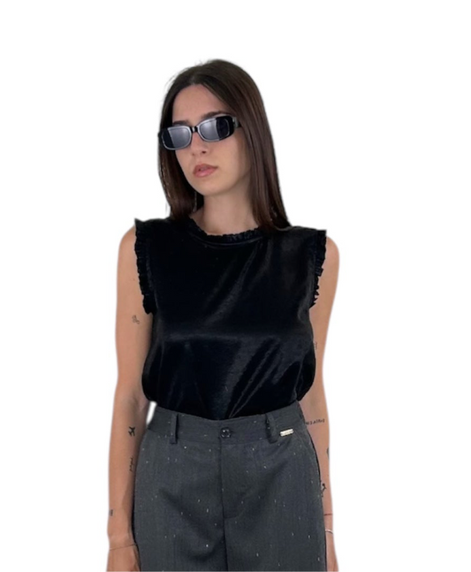 Canotta senza maniche con una vestibilità dritta e leggermente ampia, presenta delle rouches sul bordo...