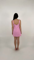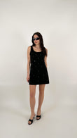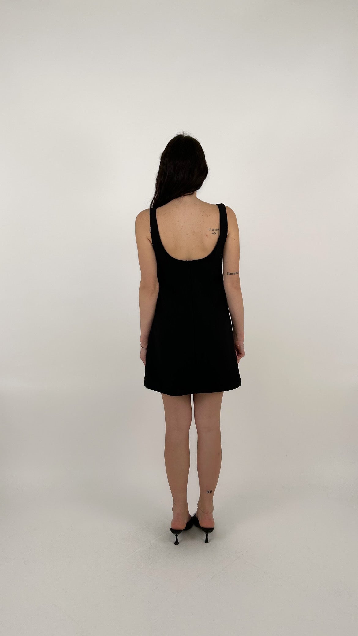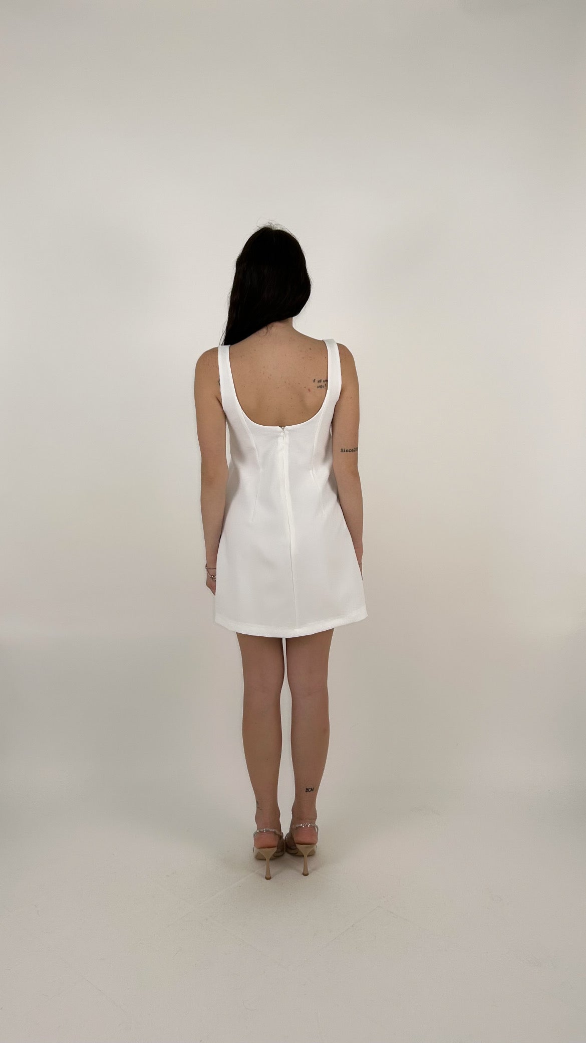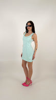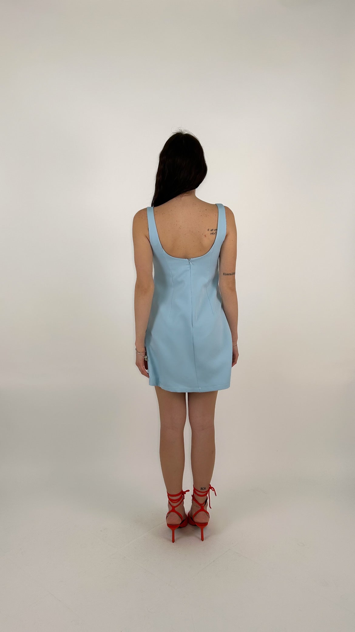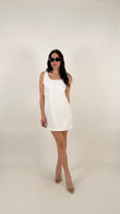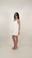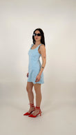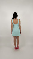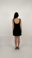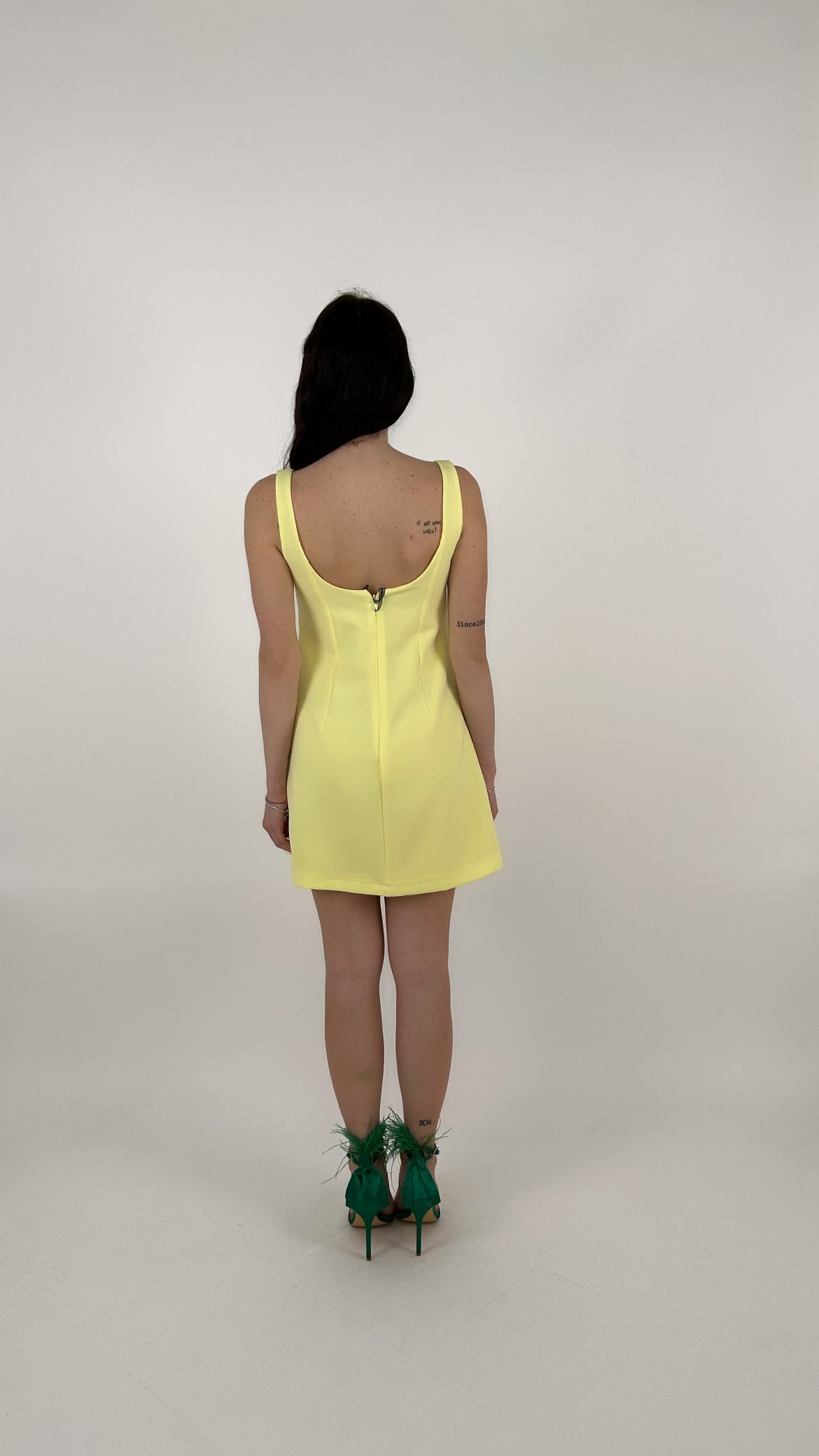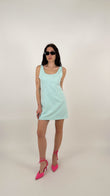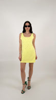 L'abito ha una linea a trapezio (A-line) leggermente accennata, che scivola morbida sui fianchi