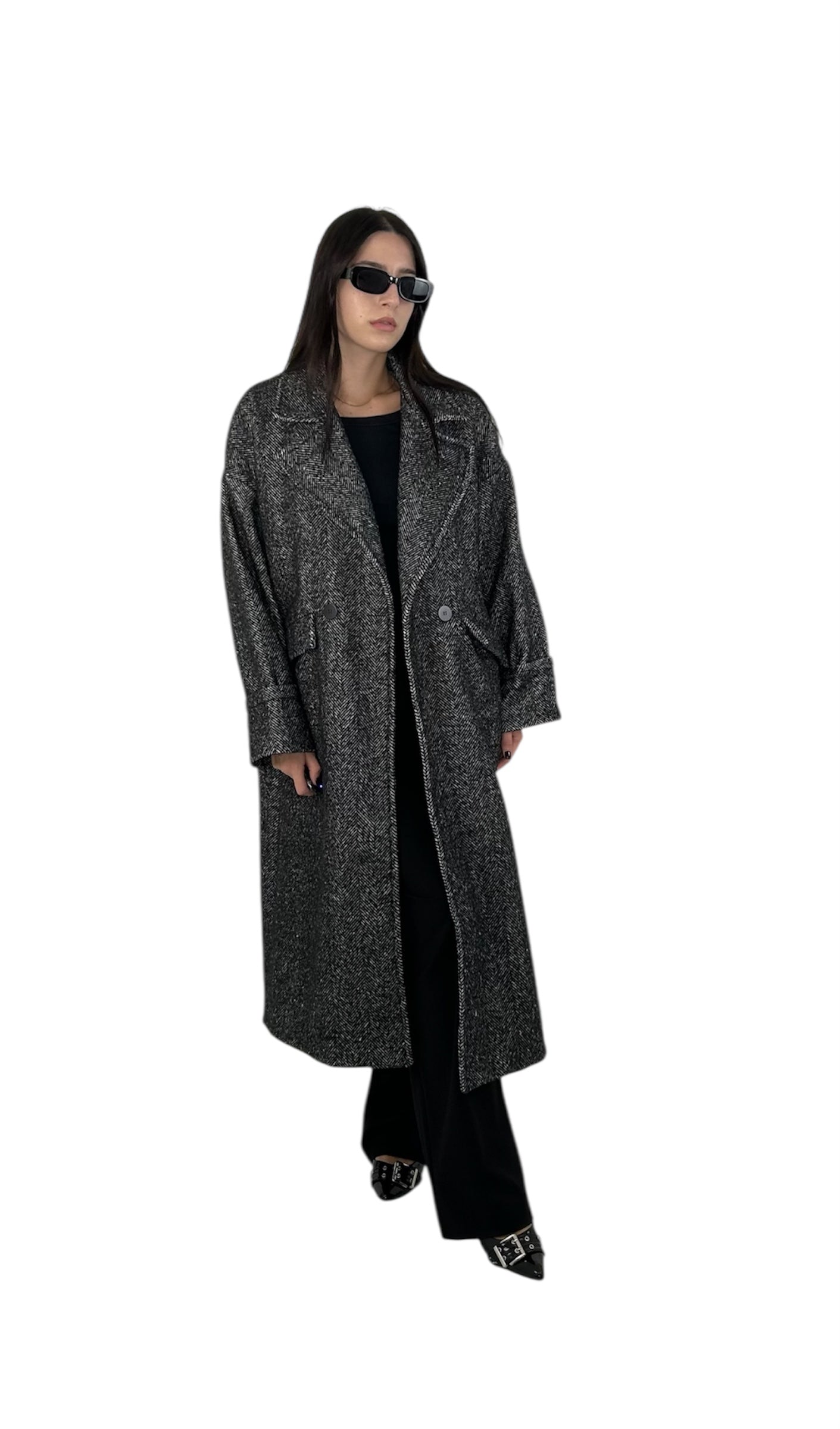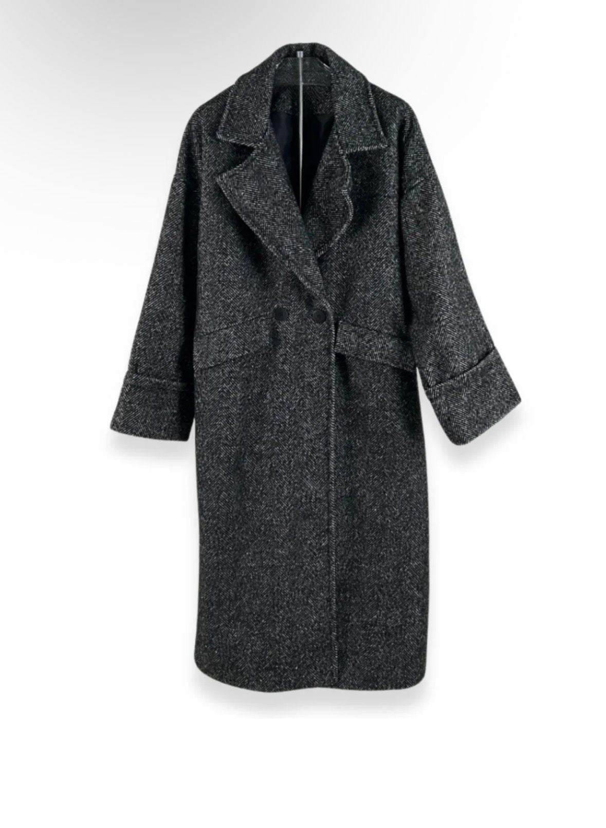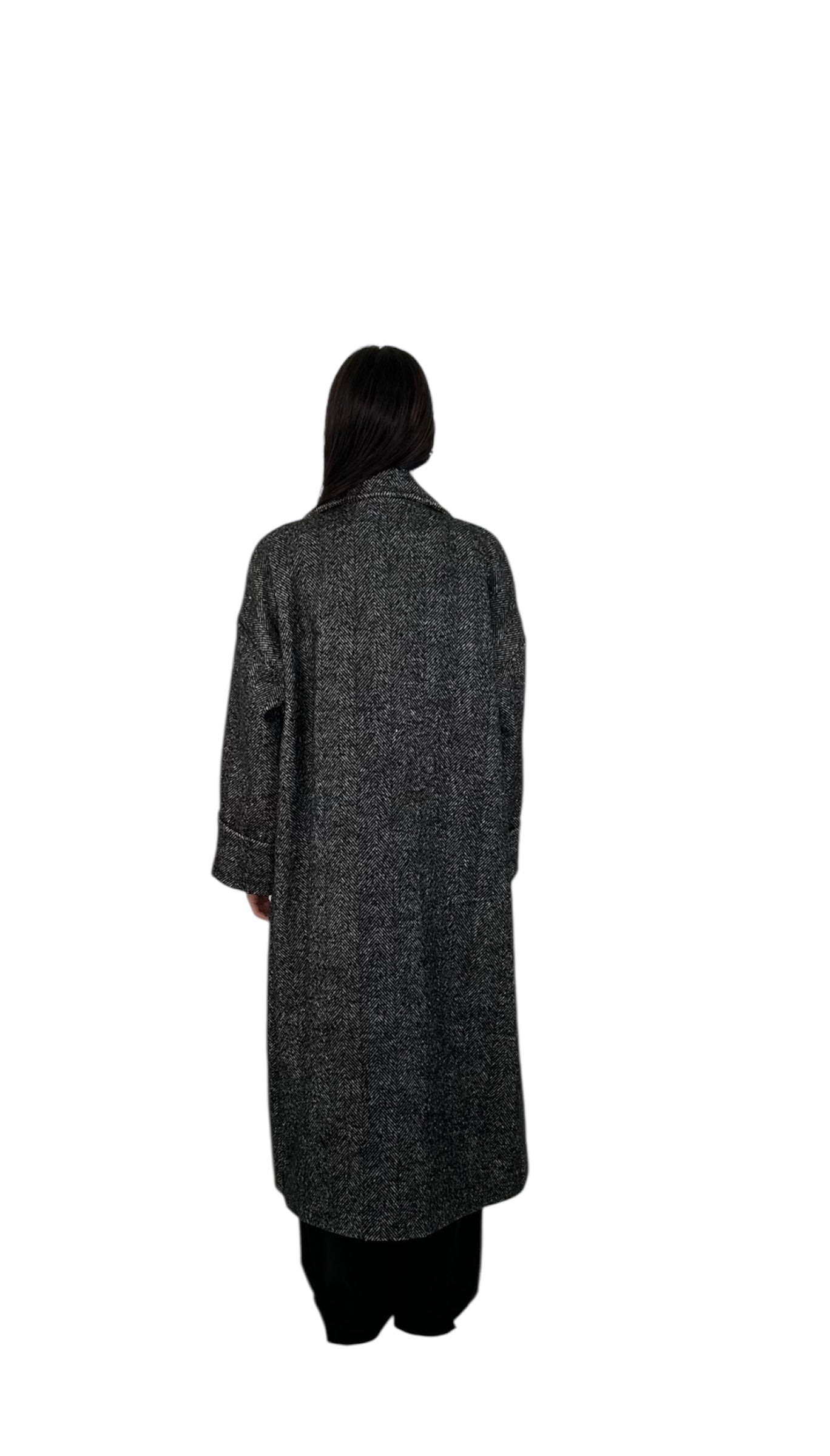 Cappotto lungo di colore grigio scuro con tessuto effetto mélange
