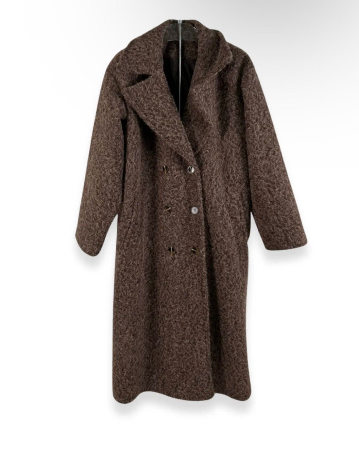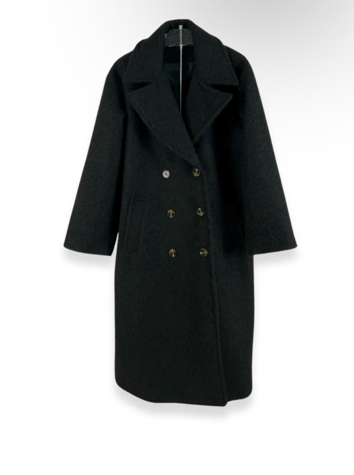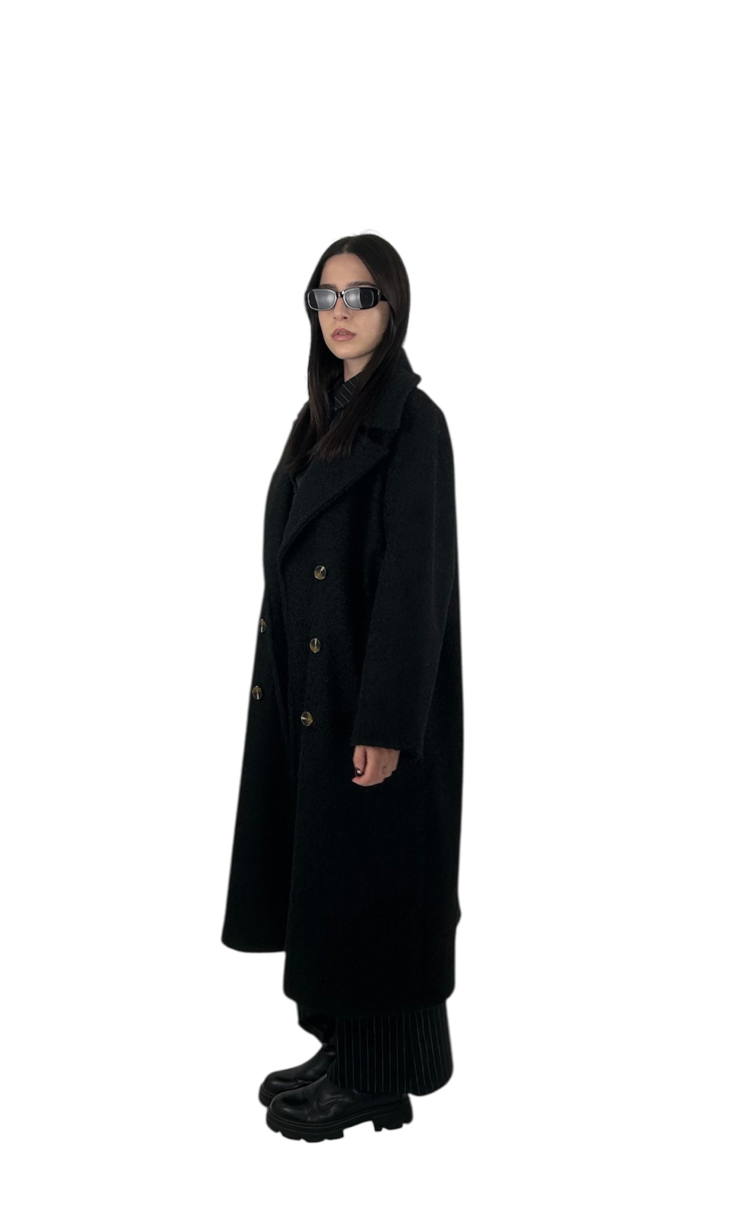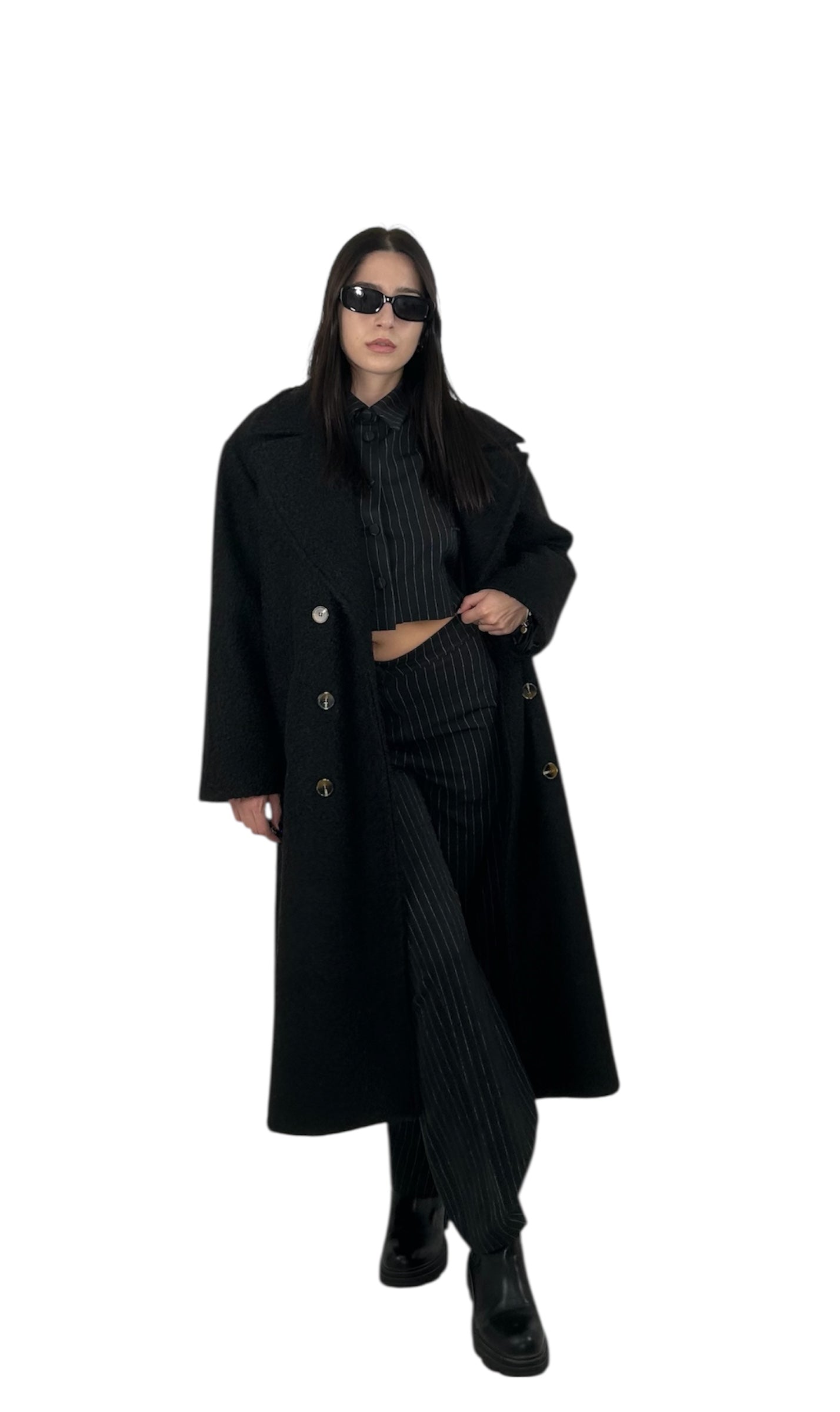 chiusura doppiopetto con sei bottoni metallici visibili disposti su due file