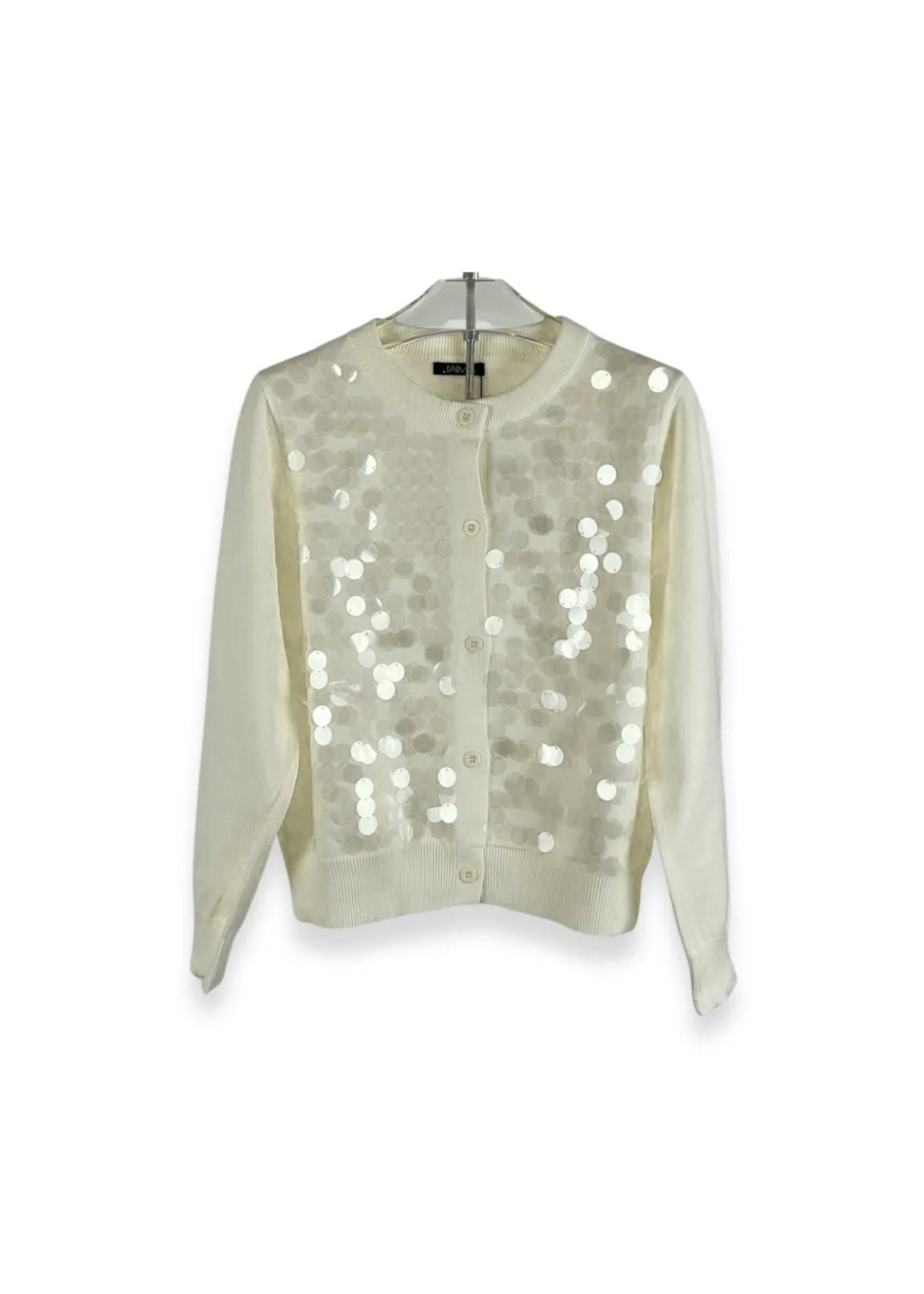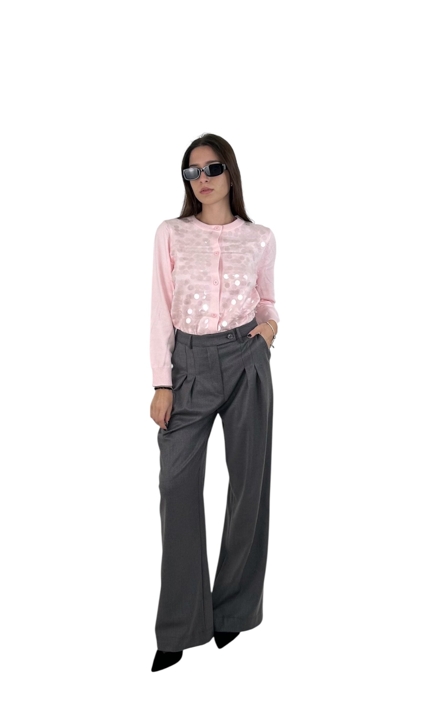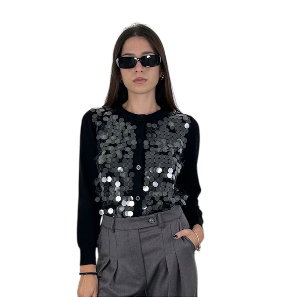 la particolarità del capo è data dalle paillettes grandi e rotonde applicate sulla parte anteriore che creano un effetto brillante e luminoso.