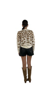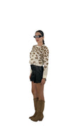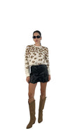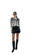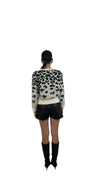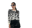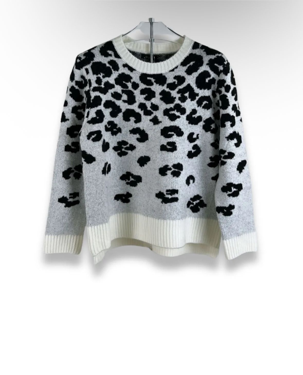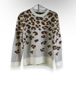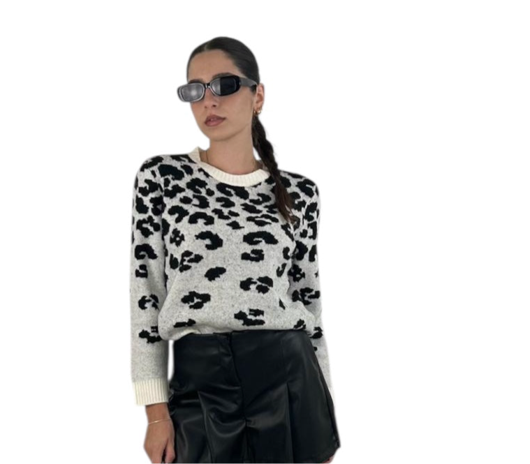 Lo scollo è tondo, rifinito con bordo a coste bianco come anche i polsini e l’orlo inferiore