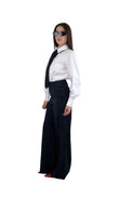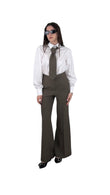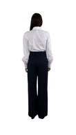 presenta una vita medio-alta con chiusura frontale a bottone e zip nascosta