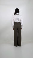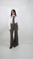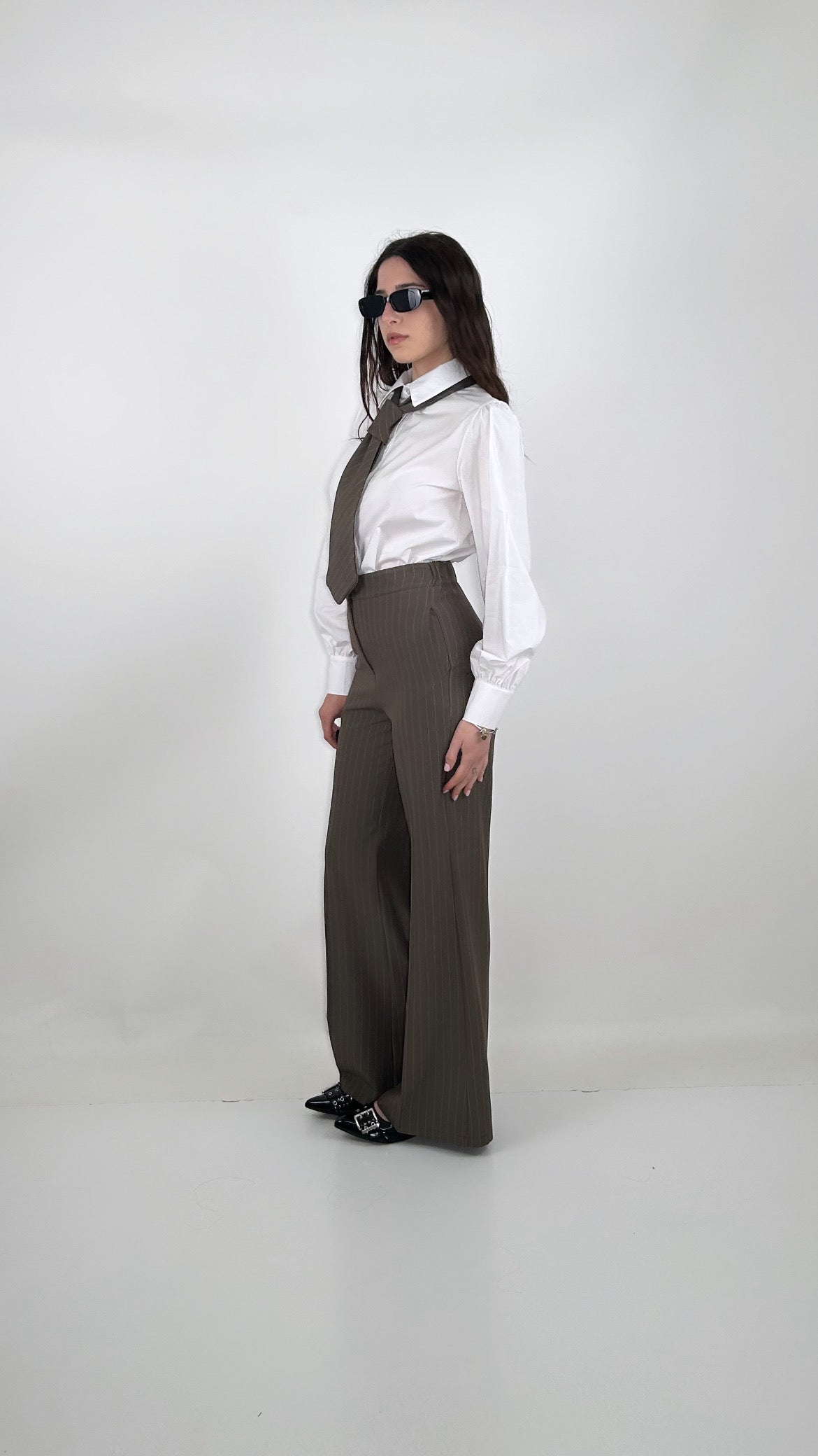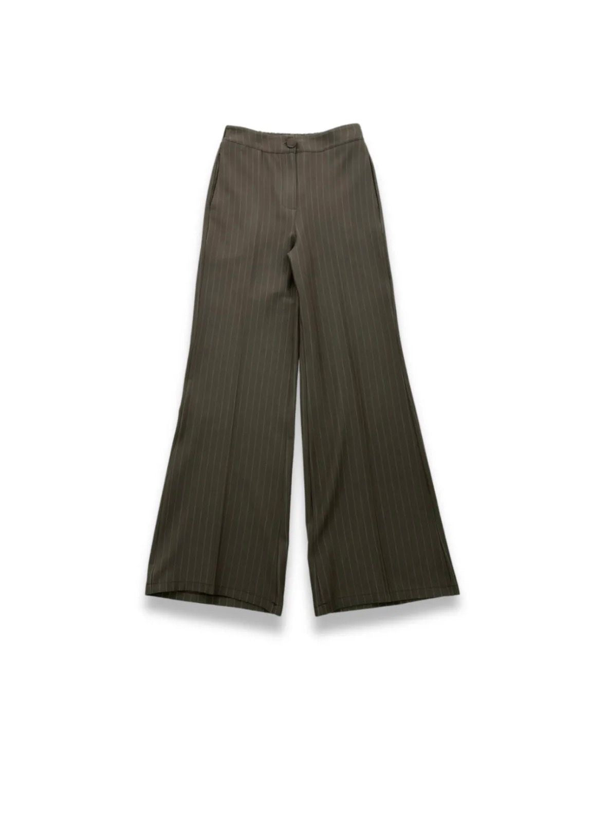 Questo pantalone gessato dalla vita alta è perfetto per un look elegante e sofisticato. Grazie alla sua leggera zampa, dona una linea slanciata e femminile. Il morbido tessuto ti farà sentire comoda e a tuo agio, mentre il bottone in tinta con il pantalone aggiunge un tocco di coesione all'outfit. Con l'elastico sul retro, avrai una vestibilità su misura per il massimo comfort.