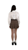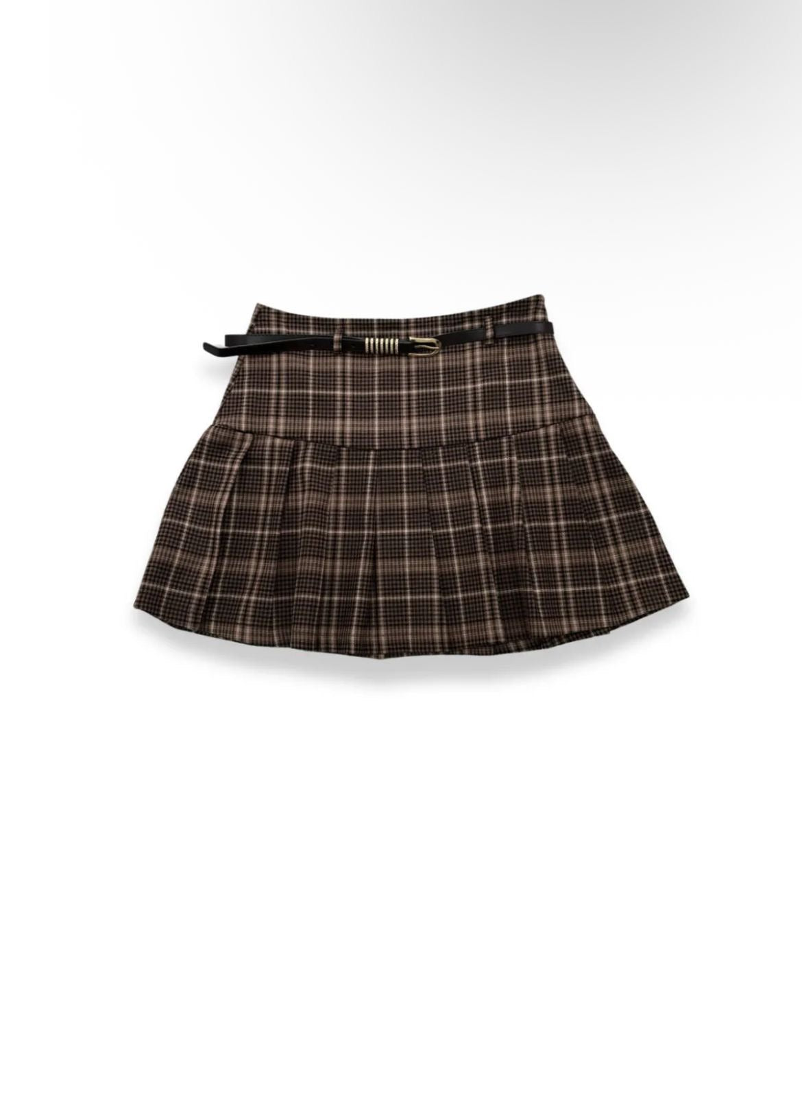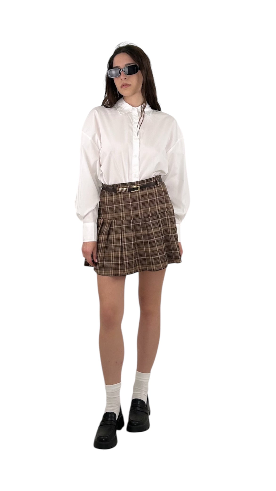 Gonna a pieghe caratterizzata da un motivo a quadri nei toni del marrone scuro e beige